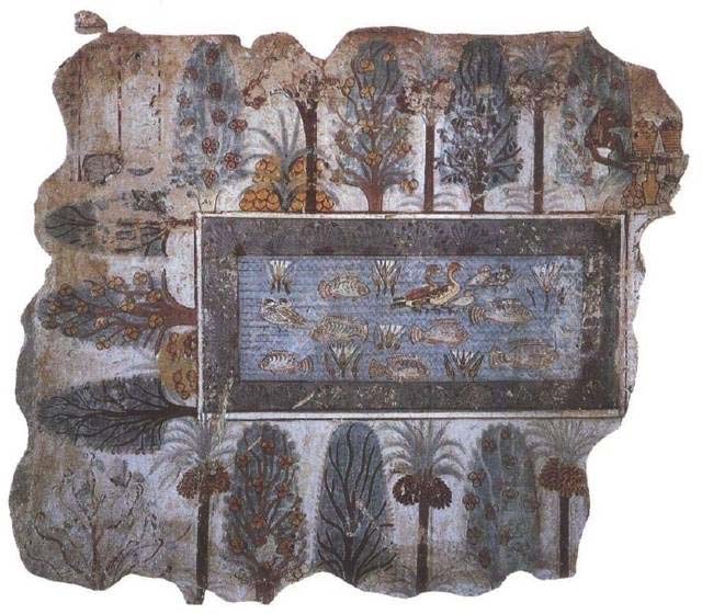 这些浮雕和壁画给我们提供了极为生动的生活画面,跟几千年前埃及的实际生活情况一样。可是,第一次观看它们时,大概会觉得茫茫然不可理解。其原因是,在表现现实生活方面,埃及画家的方式跟我们大不相同。这大概跟他们的绘画必须为另一种目的服务有关系。当时最关紧要的不是好看不好看,而是完整不完整。艺术家的任务是要尽可能清楚、尽可能持久地把一切事物都保留下来,所以他们并不打算把自然描绘成从偶然碰上的角度看到的样子。他们是根据记忆作画,所遵循的一些严格的规则使他们能把要进入画面的一切东西都绝对清楚地表现出来。事实上,他们的做法很像画地图,不像作画。图33是个简单的例子,可作说明,画中绘着一个有池塘的花园。如果叫我们来画这么一个母题(motif),就可能不知从哪个角度去表现才好。树木的形状和特点只有从侧面才能看得清清楚楚,而池塘的形状却只有从上面才能看见。埃及人处理这个问题时内心没有任何不安。他们会径直把池塘画成从上面看、把树木画成从侧面看的样子。然而池塘里的鱼禽若从上面看则很难辨认,所以就把它们画成侧面图。