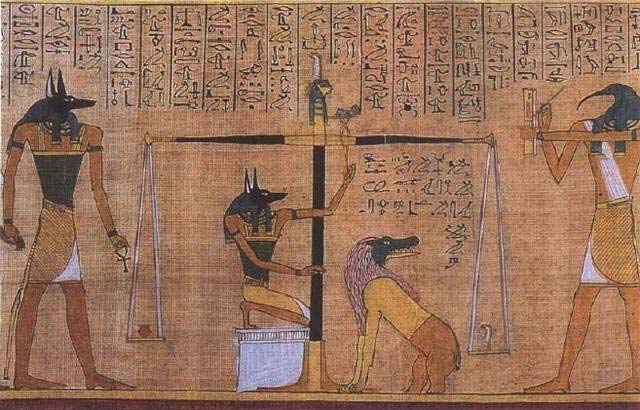 有豺头的死神阿努比斯正监督称量死者的心脏,有灵鸟头的神使在右边记录结果