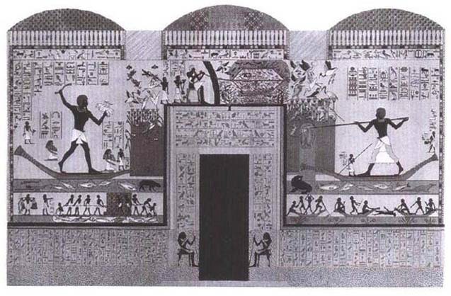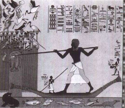 我们一旦掌握了这些规则和程式,也就懂得了记述埃及人历代生活情况的那些图画所使用的语言。图35就可以使我们很好地了解在一位埃及要人的墓室墙壁上的一般布置状况,他是公元前一千九百多年所谓“中王国”时期的人。刻辞是象形文字,确切地告诉了我们死者是谁,他一生获得过什么头衔和荣譬,我们看到他名叫克努姆赫特普(Chnemhotep),是东沙漠地区的行政长官,美那特·库孚(Menal Chufu)的领主,国王的挚友,王室的相识,祭司的监督,荷拉思神(Horus)的祭司,阿努比斯神(Anubis)的祭司,神的全部秘密的主管,绐人印象最深的,他还是所有服装行头的执掌者(Master of all the Tunics)。在左边,我们可以看见他正在用一种飞镖打野禽,陪同他的是他的妻子克提(Cheti)和侍妾杰特(Jat);还有他的一个儿子,尽管在他画中位置很小,却有着边防指挥的头衔。在下边的饰带上,我们可以看见渔人在他们的指挥官曼图赫特普(Mentuhotep)的指挥下正在拉一大网鱼。在门上边,又看见了克努姆赫特普,这一次他在用网捕捉水禽。理解了埃及艺术家的表现手法以后,我们就很容易看出他们进行捕捉的方式。捕禽者坐在一片芦苇后面隐藏起来,抓着一根绳子,绳子连着张开的捕网(网是从上面看)。水禽落在食饵上以后,他就拉绳收网裹住水禽。在克努姆赫特普背后是他的大儿子纳科特(Nacht)和兼管修墓的司库。在右边,可以看见这个被称为“鱼富禽足,热爱狩猎女神”的克努姆赫特普正在叉鱼(图36)。我们再次看到埃及艺术家的程式,他把水提升到芦苇之中,让我们在林间空地上看到鱼。刻辞说:“在纸草之河,在水禽之塘,在水泽,在清溪,他驾着独木舟,用两股叉刺杀三十条鱼;多么快活啊,在捕获河马的日子里!”下边是个挺逗人的小捕曲,一个人掉到水里,正被同伴打捞上来。环绕着大门的刻辞记录着应该给死者贡献祭品的日子,还有对神的祈祷词。