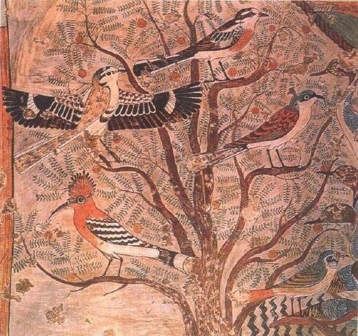 我们习惯了这些埃及图画之后,对于它们不真实的地方,就不会感到别扭了,就像我们不会计较照片没有色彩一样,甚至还认识到了埃及手法的巨大优越性。在那些图画中,没有一样东西是偶然为之,没有一样东西可以移易位置。拿一枝铅笔,试着临摹一张这种“原始的”埃及素描还是大有益处的。我们画出来的总有些笨拙,不匀称,歪歪扭扭。至少我个人如此。埃及人对每一个细节都有强烈的秩序感,以致略加变动就显得全盘大乱。埃及艺术家作画时先在墙上画直线网络,非常小心地沿着那些直线分布每个形象。可是这一几何式的秩序感,丝毫没有妨碍他以惊人的准确性精细入微地观察自然。每一只鸟和每一条鱼都画得那么真实,今天的动物学家仍然能够辨认出它的种类来。图37就是图35的一个局部,是克努姆赫特普捕网旁的那棵树上的小鸟。可见,指导着艺术家的并不仅仅是他的丰富的知识,还有对于图案的鉴赏眼光。