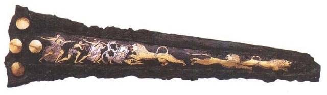 第十八王朝的这一艺术改革,国王推行起来较为容易,可能是因为他可以引证一些外国作品;那些作品比起埃及作品来,远不是那么严格生硬。海外的克里特岛(Crete)上居住着一个天才的民族,他们的艺术家喜欢表现快速的运动。他们在克诺索斯(Knossos)的王宫在19世纪末被发掘出来时,人们简直不能相信早在公元前2000年到前1000年之间竟然已产生了那样自在优雅的风格。希腊本土也发现了风格相同的作品。在迈锡尼(Mycenae)发现的一把匕首(图41)显示出一种运动感和流动的线条,它必定给埃及工匠留下了深刻的印象,正是在那个时期,埃及工匠已获准可以抛弃原来的神圣规则。