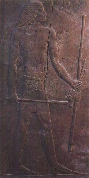 在这样简单的一幅画里,我们很容易理解艺术家的作画过程;小孩就经常使用类似的方法。但是埃及人在运用这些方法时始终如一,远远不是小孩所能比拟的。无论哪一个事物,他们都得从它最具有特性的角度去表现。从图34中可以看到用这种想法表现人体的效果。头部在侧面图中最容易看清楚,他们就从侧面画。但是,如果我们想起人的眼睛来,就想到它从正面看见的样子。因此,一只正面的眼睛就被放到侧面的脸上。躯体上半部是肩膀和胸膛,从前面看最好,那样我们就能看见胳膊怎样跟躯体接合。而一旦活动起来,胳膊和腿从侧面看要清楚得多。那些画里的埃及人之所以看起来那么奇特地扁平而扭曲,原因就在这里。此外,埃及艺术家发现,想像出哪一只脚的外侧视图都不容易。他们喜欢从大脚趾向上去的清楚的轮廓线。这样,两只脚都从内踝那一面看,浮雕上的人像看起来就仿佛有两只左脚。千万不要设想埃及艺术家认为人看起来就是那个样子。他们不过是遵循着一条规则,以便把自己认为重要的东西都包括在一个人的形状之中。这样严格遵守规则大概跟他们想行施巫术有关系。因为一个人的手臂被“短缩”或“切去”时,他怎么能拿来或接过奉献给死者的必需品呢?