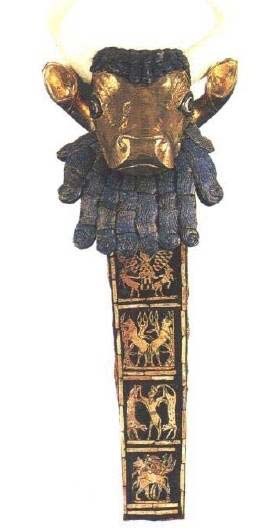 当然,埃及当时仅仅是持续了几千年之久的近东伟大强盛的帝国之一。我们从《圣经》得知,小小的巴勒斯坦就处在尼罗河畔的埃及王国跟巴比伦和亚述帝国之间,后二者在幼发拉底河和底格里斯河两河流域发展起米。希腊人称两河流域为美索不达米亚。美索不达米亚的艺术对我们来说,不像埃及艺术那样有名。这至少有一部分是出于偶然的因素。那些河谷地区没有采石场,大部分建筑用砖建成,天长日久,就风化销蚀为尘土了。连石雕也比较罕见。然而那里流传下来的早期艺术作品之所以较少,并非只能这样解释,恐怕主要原因还是在于:他们跟埃及人的宗教信仰不同,他们并不认为如果灵魂要继续生存就非保存人的尸体和肖像不可。在远古时期,一个叫苏美尔(Sumerians)的民族建都乌尔(Ur)统治这个地区时,国王还是用他的一家人和奴隶等等去陪葬,为的是在另一个世界不会缺少随从。那个时期的一些墓葬已经被发现了,我们现在可以在大英博物馆(British Museum)欣赏那些上古暴君的某些家庭财物。我们可以看到伴随原始的迷信和残酷而来的是怎样精美的艺术技巧。例如,在一座陵墓中有一架竖琴,上面装饰着传说里的动物(图43)。它们的大致形状和布局看起来都很像我们的纹章动物,因为苏美尔人爱好对称和精确。我们还不能确知那些传说中的动物的具体寓意何在,却几乎可以断言,它们必定是当时神话中的某些形象;而那些我们看着很像是出自儿童读物的场面,也必定有十分神圣,十分严肃的意蕴。