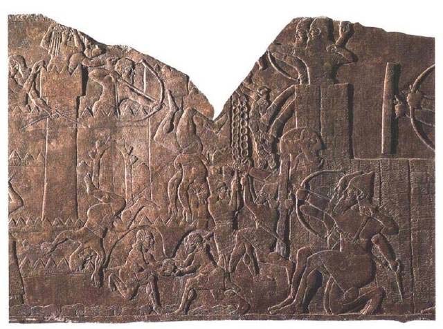 后来,这种纪念碑就发展为国王征战的完整编年史画了。现存最为完好的作品还是出自较后的年代,即在亚述王阿苏尔纳齐拉普利二世(King Asurnasirpal II)统治时期,他是公元前9世纪的人,比《圣经》上的所罗门王稍晚。这些浮雕现藏大英博物馆。我们可以在那里看到一个布置周密的战役的全部细节,我们看到军队正在渡河和正在攻击要塞(图45),还有他们的营盘和他们的膳食。那些场面的表现方式跟埃及人的方法很相近,但也许不那么整齐,不那么刻板。人们观赏时,觉得仿佛是在观看2000年前的一部新闻记录片,一切都是那么真实、那么可信。然而我们看得更仔细些,就会发现一件怪事:在那些恐怖的战争中,到处都是死伤人员,其中却没有一个是亚述人。在那些早期年代里,鼓吹和宣传的艺术竟已相当先进了。但是我们对于那些亚述人不妨稍微宽容一些,也许本书中屡有所见的那种古老的迷信思想还在他们的头脑里作祟,使他们相信,一幅画不仅仅是一幅画,还有某种超乎图画本身的东西。可能就是由于这种缘故,他们不肯描绘受伤的亚述人。无论情况如何,当时兴起的那种传统持续了很长时间。在那些赞美昔日军事领袖的纪念碑上,打仗简直轻而易举:只要你一露面,敌人就像稻草、麸皮一样迎风溃散。