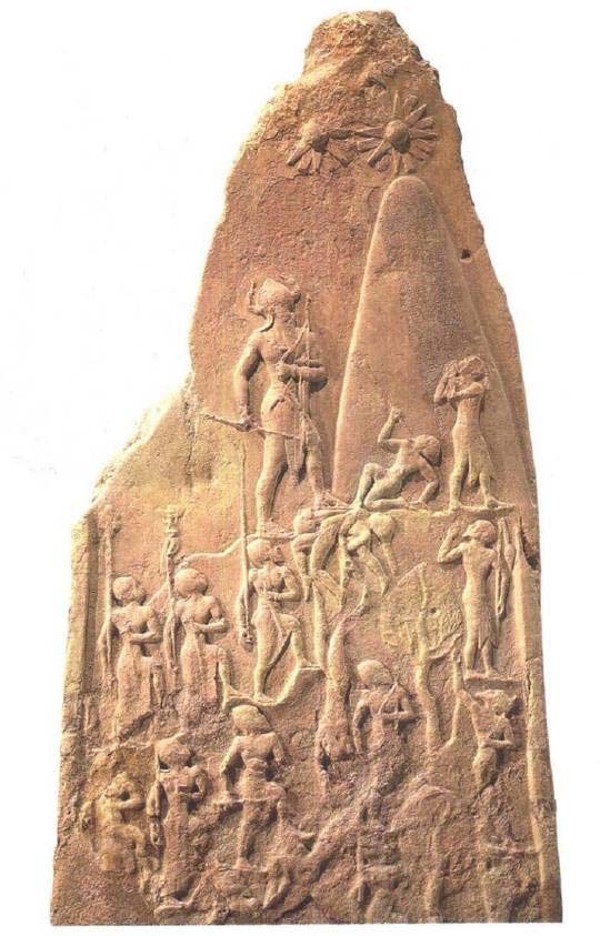 虽然没有人叫美索不达米亚的艺术家去装饰陵墓的墙壁,但是他们也不能不以另外一种方式,确保图像能帮助官高爵显者永生不灭。从很早开始,美索不达米亚的国王就习惯于竖碑勒石纪念他们的辉煌战绩,记述他们所打败的部落和获得的战利品。图44就是这样的一个浮雕,表现的是一个国王践踏着被戮之敌的尸体,面对着其他求饶的败兵。大概竖立这些纪念碑的用意还不仅仅是为保证那些战绩可以长久地记忆犹新。至少在上古时期,信奉图像威力的早期观念可能还在影响那些竖碑的人。大概他们认为,只要他们的国王在匍匐于地的敌人的颈项上踏上一只脚的图像永远存在下去,被打败的部落就永世不得翻身。