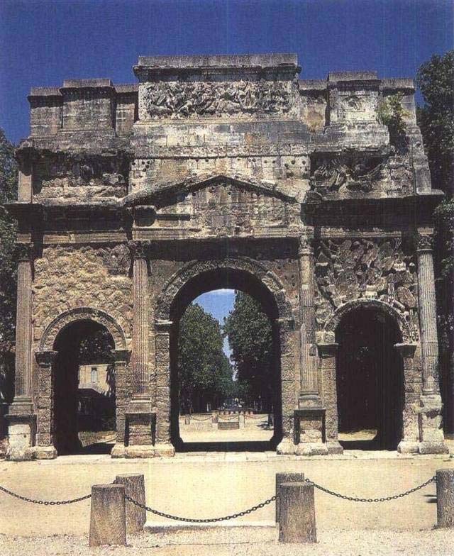 罗马的建筑创作中,大概再没有比凯旋门给人的印象更为持久的了。罗马人在意大利、法国(图74)、北非和亚洲到处建立凯旋门,遍布帝国。希腊建筑一般都是由相同的单元组成,甚至圆形大剧场也不例外。但是凯旋门却用柱式做界框并突出了中央的巨大入口,两侧辅以比较狭窄的入口。这种安排用在建筑结构中,很像是音乐中使用的和弦。
