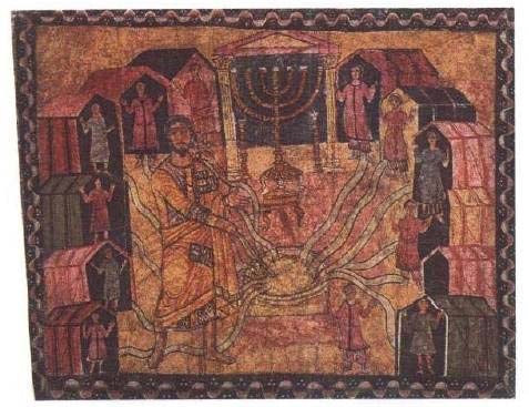 另一个懂得把它的神圣事迹描绘出来以教诲信徒的东方宗教是犹太人的宗教。犹太法(Jewish Law)实际上禁止制像,以免偶像崇拜。然而聚居在东方城市的犹太人却喜欢用《旧约》故事装饰犹太教会堂的墙壁。那些画中有一幅近年发现于美索不达米亚的一个占罗马驻军地,叫杜拉-欧罗玻斯(Dura-Europos)的小地方。这幅画无论如何也算不上伟大的艺术品,但却是公元3世纪留下的有趣的资料。它的风格看起来简陋笨拙,场面显得平板、原始,这些特点本身也不是没有意思(图82)。它画的是摩西(Moses)击磐取水的故事。但与其说它是《圣经》叙事的插图,还不如说它是向犹太人解释《圣经》意义的图片。可能就是因此而把摩西画成高个子,站在圣幕(Holy Tabernacle)前面,我们还能认出圣幕内的七连灯台。为了表示出以色列的每一个部族都分享到圣水,艺术家画了12条小河,每一条都流向站在帐篷前面的一个小人,艺术家的技术显然不大高明,所以他的画法简单。然而他实际上可能不大关心画得是否逼真。因为形象越逼真,就越要触犯禁止图像的圣训。他的主要意图是提醒观看的人,想起上帝显示神力的时刻。犹太教会堂的这幅简陋的壁画对我们还是大有意义的,因为在基督教从东方蔓延过来,而且也用艺术为自己服务时,跟上面类似的思想就开始影响艺术了。