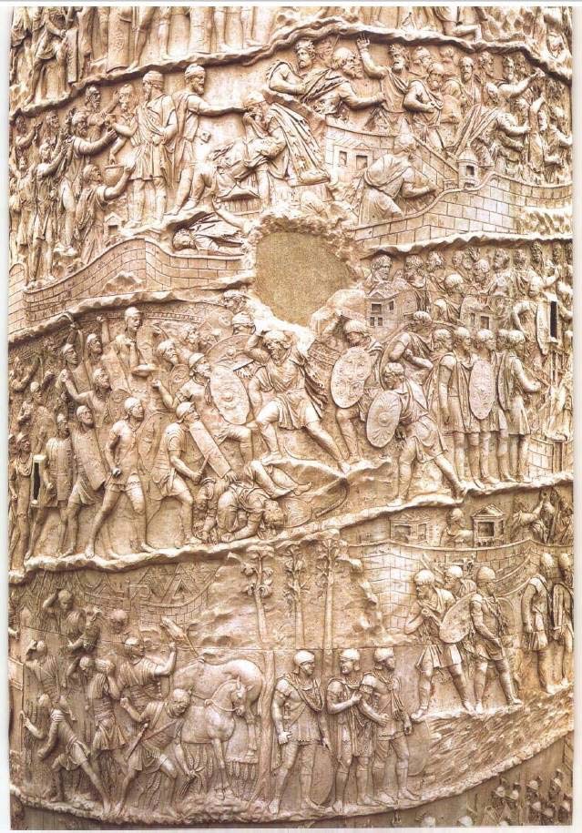 罗马人还交给艺术家另一项新任务,从而复兴了一个我们从上古东方获知的风尚(见72页,图45)。罗马人也想宣扬自己的胜利,报道战事的经过。例如,图拉真(Trajan)树立了一根巨大的石柱(图77),用图画历述他在达吉亚(Dacia,现在的罗马尼亚)作战和获胜的历程。我们在石柱上看到罗马军队集粮、征战和获胜的场面(图78)。希腊艺术几百年来的技法和成就都被用在这些战功记事作品之中。但是罗马人着眼于准确地表现全部细节和清楚地叙事,以使后方的人对战役的神奇有深刻印象,这就使艺术的性质颇有改变。艺术的主要目标已经不再是和谐、优美和戏剧性的表现。罗马人是讲求实际的民族,对幻想的东西不人感兴趣。可是他们用图画来叙述英雄业绩的方法,却被证明对宗教大有裨益,当时各种宗教已经跟蔓延扩张的帝国有了接触。