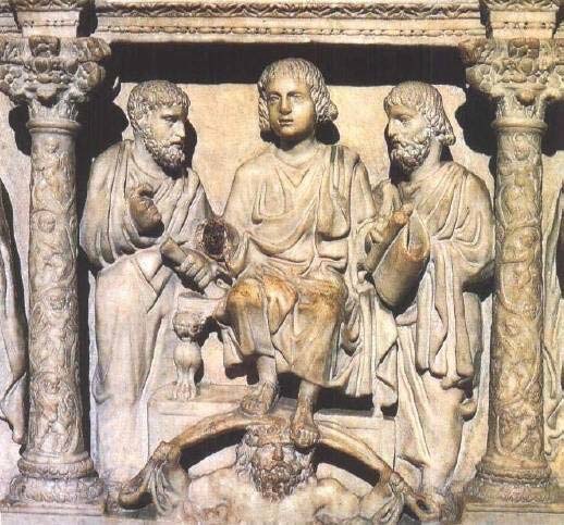 在基督教艺术家最初受命表现救世主和他的使徒时,又是希腊艺术传统帮了他们的忙。图83是最早的基督像之一,出于公元4世纪。我们看到图中的基督(Christ)不是在后来的图画中看惯的那个有须的形象,而是显现出青春之美,高坐在圣彼得(St Peter)和圣保罗(St Paul)之间,他们二人则像庄严的希腊哲学家。特别是有一个细部,使我们想到这样一个雕像跟异教的希腊化艺术方法仍然有那么紧密的联系:为了表示出基督是高坐于上苍,雕刻家让他的脚放在由古代的天空之神高高举起的天穹上面。