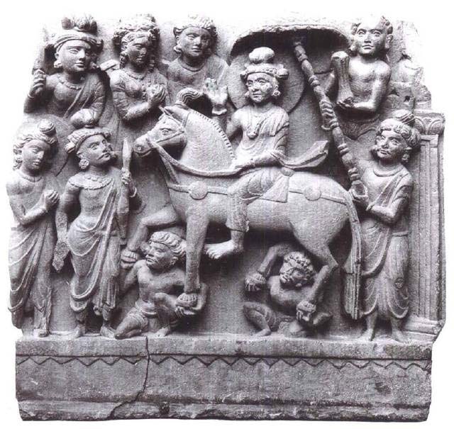 在希腊化影响到来之前,印度早已盛行雕刻艺术;然而却是在边境地区犍陀罗(Gandhara)首先出现丁佛陀的浮雕像,以后佛教艺术就以它为样板。图80表现的就是佛传中的一个插曲,叫做《夜半逾城》: