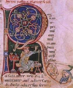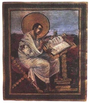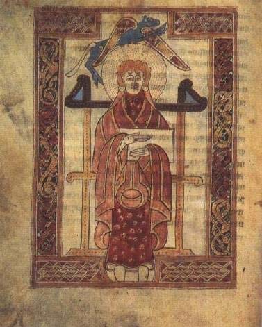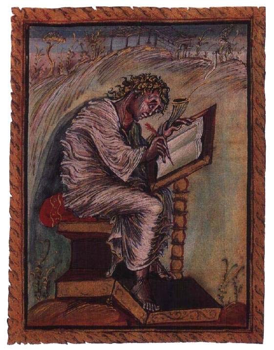 图105展现的一页是出自查理曼王朝的一本《圣经》。它画的是圣马太正在写福音的形象。希腊和罗马的书籍习惯把作者的肖像画在扉页上,这幅描绘福音书作者埋头写作的画一定是在极为忠实地描摹那一类肖像。圣徒身上衣褶裹体的外袍用了最好的古典样式,他的头用富有层次的光线和色彩造型,这种种方式都使我们确信这位中世纪艺术家全神贯注,要准确而出色地描摹一个有名的样板。
