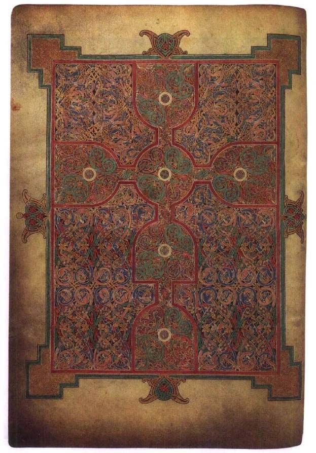 爱尔兰的克尔特人(Celtic)和英格兰的萨克逊人的僧侣和传教士,试图把那些北方工匠的传统技术运用于基督教艺术所从事的工作之中。他们仿照当地工匠使用的木结构去用石头建造教堂和尖顶(图100)。但是在他们所获得的成果之中,最惊人的不朽工作还是英国和爱尔兰在7世纪和8世纪的一些写本。图103是诺森伯里亚(Northumbria)王国著名的《林迪斯法恩福音书》(Lindisfarne Gospel)中的一页,创作时期已近公元700年。它画的是十字架,由缠绕着的龙或蛇构成极为复杂的花边组成,配上更为复杂的图案背景。尝试着从这盘曲纠结形状的令人眼花缭乱的迷宫中找到头绪,追随着那些交织的躯体构成盘涡,真是令人兴奋。可是看到结果并不混乱,各种图案呼应一致,构成了设计和色彩的多样统一,就越发出人意外。人们很难想像怎么能设想出这么一种图式,怎么有那么大的耐心和毅力去完成它。它证明了——如果还需要证明的话——采用这一本地传统的艺术家确实既有技能,又有手法。