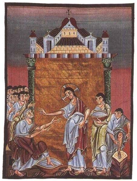 艺术家所注重的只是这个争论。他看到没有必要去画事件发生的房间;那只能分散人们对事件中心涵义的注意力。他宁可把主要人物形象置于一片平板而辉煌的金色底子之前,在这样的底子上,讲话者的姿势像庄严的铭刻一样明显突出:圣彼得的乞求动作,基督的平静施教的姿势。右边的一个门徒正在脱下靸鞋,另一个则端来一个水盆,其他人簇拥在圣彼得身后。大家的眼睛都直瞪着画面中心,这就使我们感到那里发生了什么重大的事情。即使水盆并不那么圆,即使画家不得不把圣被得的腿向上扳,把膝盖向前提一些,使他的一只脚能清清楚楚地放在水中,这又有什么关系呢?他关心的是表达这个神圣谦抑的要义,而这一点他也确实表达出来了。