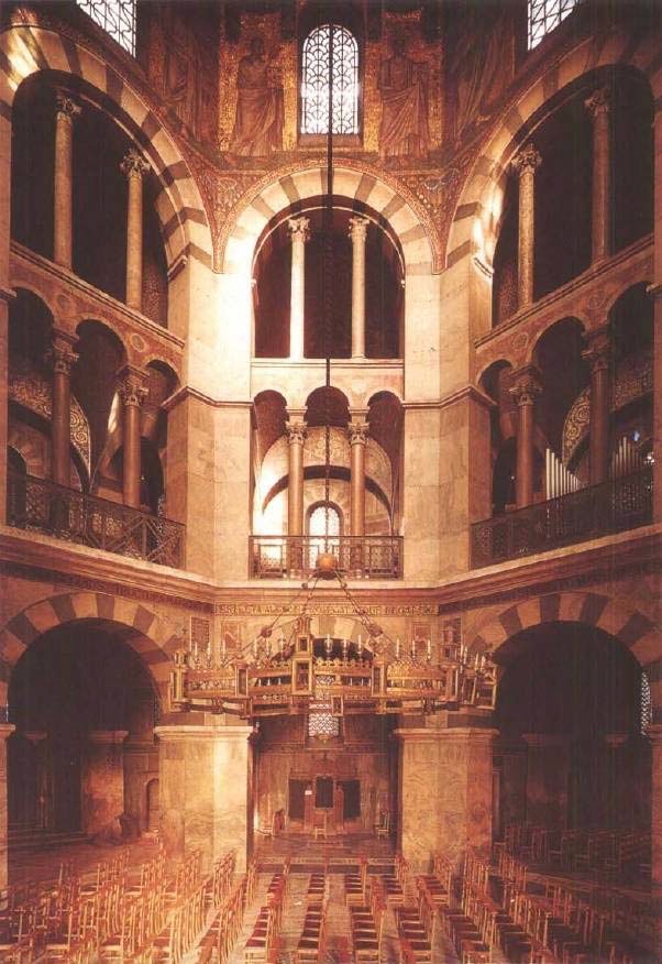 以往古典艺术成就的知识绝不是完全失传。在自认为是罗马皇帝继承人的查理曼(Charlemagne)的王朝中,急切地复兴了罗马的技艺传统。大约公元800年,查理曼在亚琛(Aachen)的宫廷所在地建起了一座教堂(图104),相当接近于大约300年前在拉韦纳建造的一所著名的教堂。