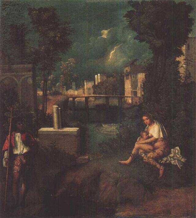 乔瓦尼·贝利尼跟韦罗基奥、吉兰达约和佩鲁吉诺是同一代人,那一代人的学生和追随者是著名的16世纪的大师。他也是一所非常繁忙的作坊的主人,从他的圈子里出现了威尼斯16世纪著名画家乔尔乔内(Giorgione)和提香(Titian)。如果说意大利中部的古典风格画家以完美的设计和平衡的布局为手段已经使他们的整个画面达到了新的和谐,那么威尼斯画家势必要效法乔瓦尼·贝利尼,他已经如此巧妙地用色彩和光线统一了画面。就是在这个领域中,画家乔尔乔内(1478?-1510)取得了最革命的成果。对于这位艺术家我们所知寥寥,能够断定确实出于他手的作品至多不过五幅。然而那些画就足以便他获得盛名,几乎可以跟那场新艺术运动的伟大领导者们匹敌。相当奇怪的是,连那些画中也包含有某种谜的成分。我们还不能肯定他那最出色的一幅画《暴风雨》(The Tempest)(图209)画的是什么;它可能是取材于某个古典作家或仿古典的作家所描绘过的场面。因为那个时期的威尼斯艺术家已经认识到希腊诗人的魅力和他们的旨趣。他们喜欢用图画表现出牧歌似的田园爱情故事,喜欢描绘维纳斯与仙女的美丽。这里表现的故事有可能在将来某一天找到出处——故事大概是说一个未来的英雄的母亲,带着孩子从城里被赶到荒野,在那里被一位善良的年轻牧人发现。这似乎就是乔尔乔内想表现的内容。然而并不是由于这种内容才使它成为最奇妙的艺术珍品之一。它成为佳作的原因在这种小尺寸的插图中可能不易看出,然而即使是这样一张小插图至少也能略略展现一点他的革命性成就。虽然人物形象勾画得并不十分仔细,虽然构图有些缺乏艺术性,然而这幅画显然是由充满了整个画面的光和空气把它融合为一个整体的。正在画面上活动的人物身后的风景,由于雷雨的奇异闪光,也似乎使我们第一次不再把它当作单纯的背景,风景本身凭其资格已成了这幅画的真正题材。我们的眼光从人物身上转向那占据着画面主要部分的景色,然后再返回来,不知怎么会感觉乔尔乔内不同于他的前辈和同代人。他不是勾画出物体和人物,然后再把它们布置到空间当中,他实际上是把自然界,那大地、树木、光、空气和云,跟人连同人们的城市和桥梁都想像为一个整体。这似乎是向新领域进军迈出的一大步,几乎像过去发明透视法时迈出的步伐那样伟大。从此以后,绘画就不仅仅是素描加色彩,它成为一种有其独特的奥妙法则和手段的艺术了。