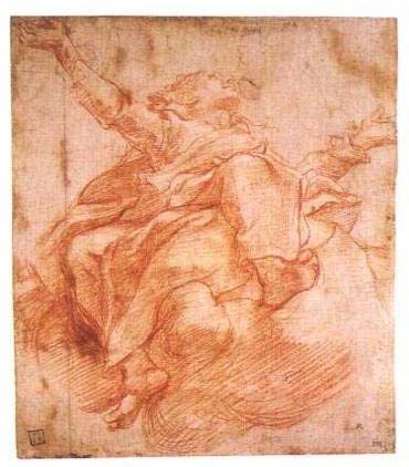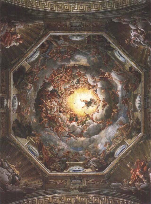 科雷乔的作品有一个为后人代代追摹的特色,那就是他用以彩绘教堂的天花板和穹窿顶的方法。他试图给予下面中殿里的礼拜者一种幻觉,好像天花板已经打开,他们一直向上看到了天堂的荣耀。他控制光线效果的技艺,使他能在天花板上画出阳光照耀的云彩,云彩之间的天使群好像双腿悬垂着在翱翔。听起来这也许不大庄严,当时也的确有人在反对。然而当你站在帕尔马城的黑暗、阴郁的中世纪的主教堂里,向上仰望圆顶时,仍然会产生深刻的印象(图217)。可惜这种效果不易在插图中复制。不过,幸运的是,我们依然拥有一些他在准备此画时所作的素描。图216是他表现圣母的最初构思:圣母乘云升天,出神地望着从等待她的天国中倾泻下来的光线。这幅素描显然比湿壁画中的形象易于理解,因为湿壁画中的人物变形得更为厉害。此外,我们还可以看到科雷乔以寥寥的几道粉笔线条就暗示出了那么耀眼的光线,手法是多么简洁。
