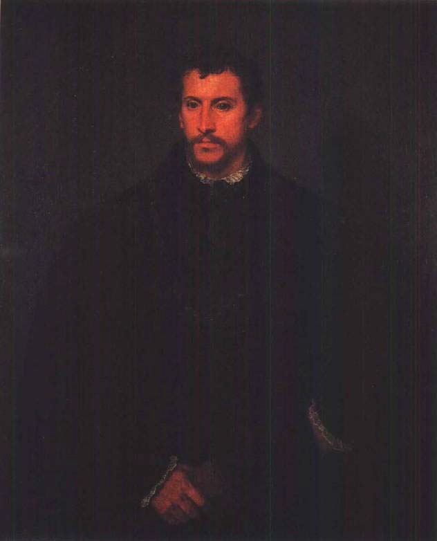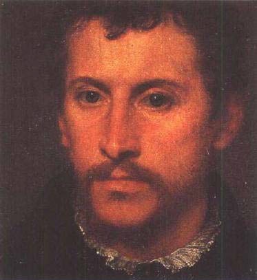 提香在同代人中以肖像画博得最伟大的名声,只要看看图212那样一幅通称《年轻的英国人》(Young Englishman)的肖像画的头部像,就不难体会他的肖像画的魅力。我们也许会徒劳地去分析画中的魅力来自何处。跟以前的肖像画相比,这幅画处处都是那么单纯,那么平易,丝毫没有莱奥纳尔多的《蒙娜·丽莎》那种微妙的造型——然而这位不知其名的青年男子看来跟她同样神秘地生气十足。他似乎凝视着我们,那样热切而深情,让人几乎不能相信那柔和怡神的眼睛不过是涂在一块粗糙画布上的颜料(图213)。