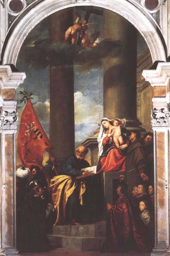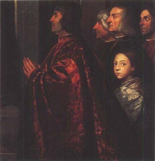 乔尔乔内死的时候太年轻,还来不及把这一伟大发现发挥得淋漓尽致。完成这项大业的是威尼斯最负盛名的画家提香(约1485?-1576)。提香出生在阿尔卑斯山南部的卡多尔(Cadore),传说他99岁时死于瘟疫。在漫长的一生中,他获得了很高的声誉,几乎可以跟米开朗琪罗相颃颉。他较早的传记作者敬畏地告诉我们,连伟大的查理五世大帝(Emperor Charles V)也曾为他拾起过掉在地上的画笔,表示敬意。我们可能认为拾起画笔没有什么了不起,但是想一想那个时代宫廷的严厉法规,我们就不难明白,人们认为那是人间权力的至高代表在天才的威严面前做出的象征着低首下心的举动。从这种意义来看,对于其后的时代,这段小轶事不论真假都意味着艺术的一种胜利。提香不是莱奥纳尔多那样包罗万象的学者,不是米开朗琪罗那样超群出众的名人,也不是拉斐尔那样多才多艺、博雅迷人的人物,就更加证明这是艺术的一个胜利。提香主要是个画家,但却是个在驾驭颜色的工夫上可以跟米开朗琪罗的精通素描法相匹敌的画家。这种至高无上的技艺使他能够无视任何久负盛名的构图规则,而依靠色彩去恢复显然被他拆散了的整体。我们只要看一看图210(开始动手的时间仅仅比乔瓦尼·贝利尼的《圣母和圣徒》一画晚15年左右),就能认识到他的艺术对当时的人必然要产生什么效果。几乎是前所未闻,他竟把圣母移出画面的中央部位,而且那两个侍奉圣徒——带着圣痕(十字形伤痕)的圣芳济(St Francis)可以由之辨认出来,圣彼得已经把钥匙(他的尊严的标记)放在圣母宝座的台阶上——也不像乔瓦尼·贝利尼画的那样对称地安置在两边,而是场面中的积极参与者。在这幅祭坛画中,提香不得不恢复供养人肖像的传统(见216-217页,图143),但他用全新的方式来处理。这幅画打算作为感恩祈祷的标志,纪念威尼斯贵族雅各布·佩萨罗(Jacopo Pesaro)跟土耳其人作战的一次胜利。提香把佩萨罗描绘为跪在圣母前面,有一个全身甲胄的旗手在身后拖着一个土耳其俘虏。圣彼得和圣母慈祥地向下看着佩萨罗,而圣芳济正在另一边指引圣婴基督去注意佩萨罗家族的其他成员,他们都跪在画面的角落里(图211)。整个场面好像是在一个露天的庭院里,两根巨大的圆柱直入云端,云中有两个小天使正在顽皮地举起十字架。提香的同代人可能已经对他的胆大妄为感到吃惊,这不是没有原因的,他竟敢推翻久已确定的构图规则。一开始,他们一定认为在这样一幅画上能找出不匀称、不平衡的地方。事实却恰恰相反;那出人意外的构图反而有助于使画面欢快而活泼,又无损于整体的和谐。主要的原因是提香设法用光、空气和色彩把场面统一起来。画中只让一面旗帜去平衡圣母的形象,这种想法大概会使上一代人感到震惊,然而这面旗帜的色彩富丽而温暖,画得那样了不起,使这场冒险获得了彻底的成功。
