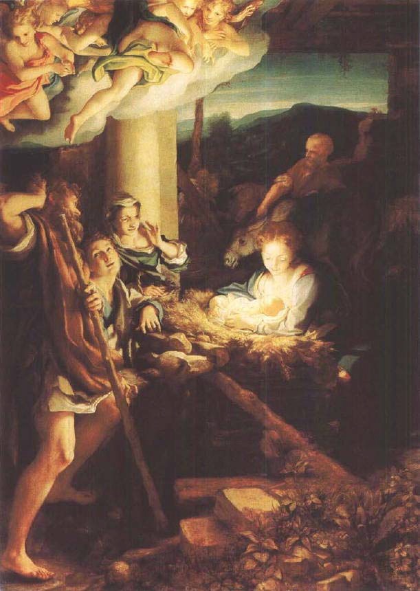 乍一看,这个布局显得十分笨拙、十分随意。左边场面很拥挤,似乎右边没有任何对应的部分加以平衡,仅仅是用光来突出圣母和圣婴借以取得平衡。在这一方面,科雷乔甚至比提香更多地使用了以色彩和光线来平衡形状和引导眼睛视线方向的这项发现。我们自己也跟着牧人一起冲向这个场面,而且被引导着看见了他所看见的景象——《约翰福音》中所说的在黑暗之中放射光芒的奇迹。