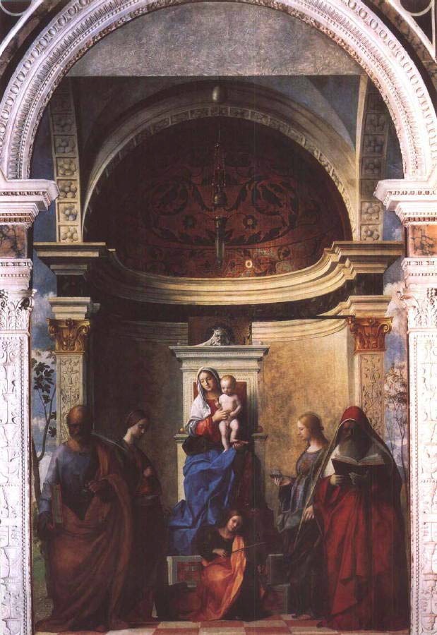 这座建筑具有一种特殊的艺术趣味,正是这种特点使16世纪的威尼斯艺术闻名于世。环礁湖发射出灿烂的光辉,似乎使物体的鲜明轮廓变得朦胧不清,调和了它们的色彩,这种环境可能已经使得威尼斯的画家们运用色彩时比其他意大利画家更为深思熟虑,精细入微。他们跟君士坦丁堡及其镶嵌画工匠有联系,也许因此产生了这一倾向。相当准确地谈论或描述色彩是很困难的,从彩色插图中也很难了解一幅画实际是什么样子。但是看来十分清楚的是:中世纪画家不关心事物的“实际”形状,也不关心事物的“实际”颜色,在他们的细密画、珐琅作品和画板上,他们喜欢使用他们能找到的最纯净、最珍贵的色彩——光辉闪闪的金色和完美无瑕的群青蓝是一种最受喜爱的配合。佛罗伦萨的伟大的艺术改革者对色彩的兴趣也不如对素描的兴趣大。当然这并不意味着他们的绘画作品不精美——事实上正好相反——但是他们很少有人把色彩当作主要手段之一,用它把画面上的各种人物和形状结合成一个统一的图案。他们比较喜欢在画笔甚至还不曾蘸上颜料之前,用透视法和构图法作为手段去组织画面。威尼斯画家好像并不把色彩看作是作品完工以后再添加的装饰。人们进入威尼斯的圣·扎卡西亚(San Zaccaria)小教堂以后,面对伟大的威尼斯画家乔瓦尼·贝利尼(Giovanni Bellini, 1431?-1516)1505年在那里作的祭坛画(图208),立刻就发觉他用色的方法大不相同,这并不是说这幅画特别明亮或光芒四射,而是说它的色彩柔和而富丽,人们甚至还来不及看看画中的内容是什么就产生了深刻的印象。我认为连照片都能把那充满壁龛内部的温暖而富丽的气氛传达出几分来;圣母坐在壁龛里面的宝座上,幼小的耶稣正举起小手为祭坛前面的礼拜者祝福,一个天使在祭坛脚下轻柔地演奏小提琴,圣徒们则安静地站在宝座两边:有拿着钥匙和书的圣彼得,有拿着象征殉难的棕榈和破车轮的圣凯瑟琳(St Catherine),有圣阿波洛尼娅(St Apollonia),还有圣哲罗姆(St Jerome)那位学者,他把《圣经》译成了拉丁文,所以贝利尼把他画成正在读一本书。在以前和以后,意大利和其他地方都画过许多圣母和圣徒在一起的像,但是很少有设想得这样高贵,这样沉静的。在拜占廷的传统中,圣母画一贯是两边生硬地排列着圣徒像(见140页,图89)。贝利尼懂得怎样使这简单对称的布局既有生气又不破坏它的秩序。他也知道怎样把传统的圣母和圣徒形象改变为现实中活生生的人物,却不剥夺他们的神性和尊严。他甚至也没有牺牲现实生活的多样性和个别性,而佩鲁吉诺对此就有一定的牺牲(见314页,图202)。圣凯瑟琳隐约的微笑和老学者哲罗姆聚精会神读书的形象,各有其独特的真实之处。然而他们跟佩鲁吉诺的人物一样,似乎也属于另一个更宁静、更美丽的世界,那个世界已倾注了温暖而神奇的光线,充满了整个画面。