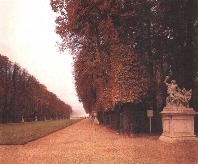 不仅仅是罗马教会发现了艺术有感染和征服人心的威力。17世纪欧洲的国王和君主同样急于显示他们的强权,从而加强他们对人心的控制。他们也想作为一种不同凡俗的人出现,根据神授王权的观念高踞于普通人之上。17世纪后半期最强大的统治者法国的路易十四表现尤其突出,他在政策中处心积虑地利用王权的夸示和显赫。路易十四邀请洛伦佐·贝尔尼尼到巴黎去帮忙设计他的王宫,这绝不是偶然的事情。那个宏伟的规划并没有实现,但是路易十四的另一座王官却成为他的巨大权力的真正象征。那就是凡尔赛宫(Palace of Versailles),大约建于1660年到1680年(图291)。凡尔赛宫非常巨大,照片难以使人对它的外观有正确的认识。它的每一层都至少有123个窗户,朝向花园。花园本身有修剪整齐的林荫道、石瓮和雕像(图292),连同台地和池塘,向乡下延伸达数英里。