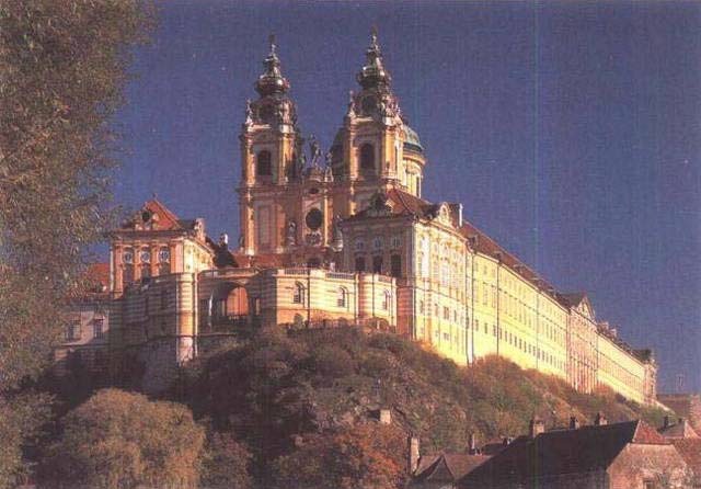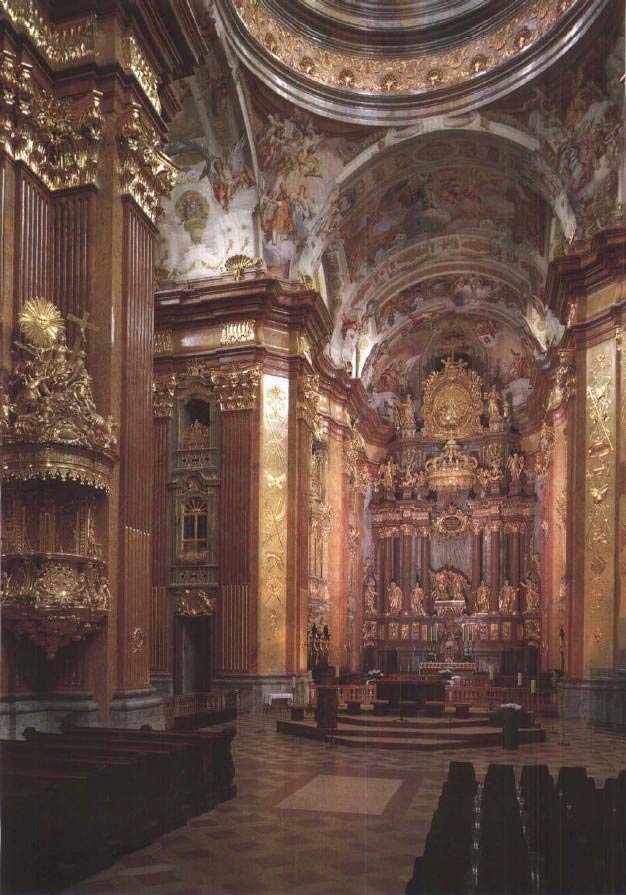教会的建筑物也使用了类似的惊人效果。图296是奥地利多瑙河畔梅尔克的修道院(monastery of Melk)。当人们顺流而下的时候,修道院,还有它的穹窿顶和奇形怪状的塔楼,矗立在山上,好像是奇异的幻影。这座建筑是一位叫做雅各布·普兰德陶尔(Jakob Prandtauer, ?-1726)的本地建筑师修建的,其装饰则出于一些意大利的旅行virtuos(艺匠)之手;那些旅行艺匠备有从巴洛克图形的丰富宝藏中得来的新颖的想法和设计。那些卑微的艺术家能把一座建筑物分组地组织在一起,形成高贵而不单调的外观,他们所掌握的艰深的技术是多么精湛!他们也细心地把装饰分成等级,在他们想加以突出的那些建筑部分中节俭地、然而却更加有效地使用那些最为奢侈的装饰形式。