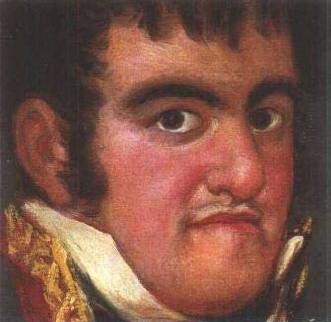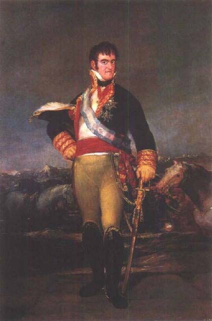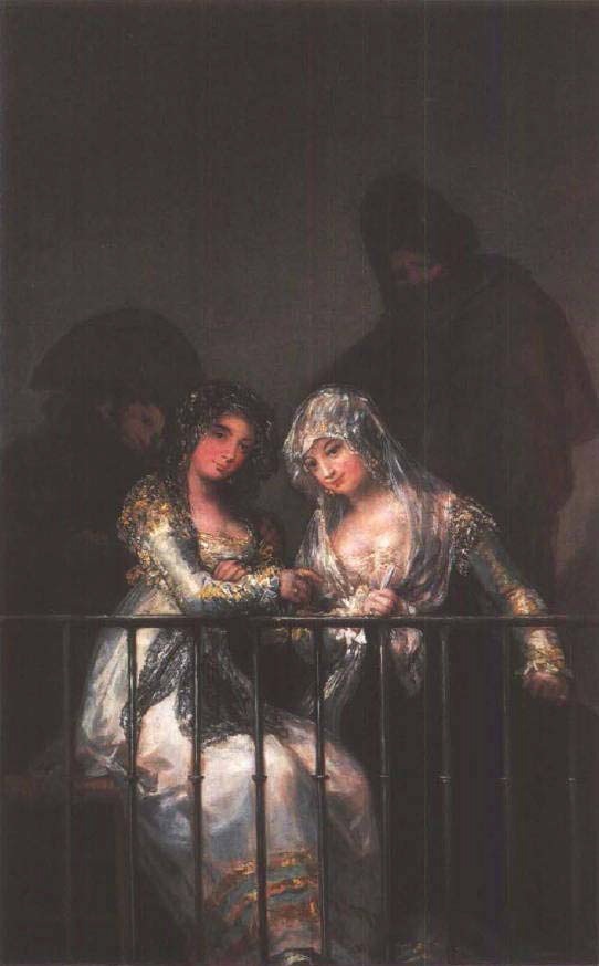 在达维德那一代摈弃旧式题材的艺术家中,有伟大的西班牙画家弗朗西斯科·戈雅(Francisco Goya, 1746-1828)。戈雅对产生过埃尔·格列柯(见372页,图238)和委拉斯开兹(见407页,图264)的西班牙绘画最佳传统十分精通,他画的阳台群像(图317)表现出他跟达维德不同,他并不抛弃传统技艺去追求古典的宏伟。伟大的18世纪威尼斯画家乔瓦尼·巴蒂斯塔·提埃坡罗(见442页,图288),作为马德里的宫廷画家已经故去,但在戈雅的画中还有他的一些光彩。然而戈雅的人物属于另外一个世界。这幅画中有两个相当凶恶的情郎处在背景之中,而挑逗地注视着路人的两个女人可能比较接近贺加斯的世界。使戈雅在西班牙宫廷获得一席之地的肖像画(图318),表面上看起来很像凡·代克或雷诺兹传统的正式肖像画。他表现丝绸和黄金的闪光的技艺使人回想起提香或委拉斯开兹。但是他也用一种不同的眼光去观察他所画的人。那些大师并不谄媚权贵,但是戈雅好像更不留情。他画的人物的面貌把他们的虚夸和丑陋、他们的贪婪和空虚暴露无遗(图319)。前无古人,后无来者,再没有一个宫廷画家为他的顾主留下这样一个记录。