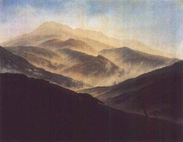 艺术跟传统决裂,使艺术家面临两种可能性,体现在特纳和康斯特布尔身上。他们能够变成以绘画为手段的诗人,去寻求动人的戏剧性效果,否则就决心固守面前的母题,用他们的全部毅力和诚实去探索它。在欧洲的浪漫主义画家中的确有伟大的艺术家,例如跟特纳同代的德国画家卡斯帕尔·达维德·弗里德里希(Caspar David Friedrich, 1774-1840),他的风景画便反映出当时浪漫主义抒情诗的情趣,通过舒伯特的歌曲,我们对那种抒情诗是较为熟悉的。他的一幅光秃秃的山地景色画(图326)甚至可以使我们回想起近乎诗意的中国风景画的精神(见153页,图98)。但是,不管那些浪漫主义画家中有一些人在极盛时期获得的声名多么伟大、多么当之无愧,我还是认为那沿着康斯特布尔的道路、试图探索可见世界而不去唤起诗意情趣的艺术家取得的成果有更持久的重要性。