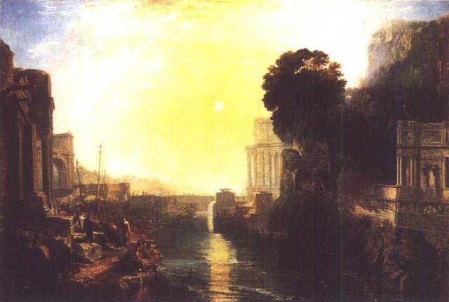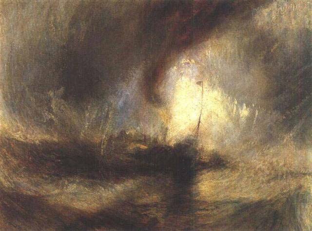 有一个绘画分支大大受益于艺术家选择题材的新自由,那就是风景画。以前风景绘画一直被看成是艺术的一个小分支,尤其是以画乡间宅第、花园或如画的景色之类的“风景图”(views)为生的画家们,并不被真正当作艺术家看待。18世纪晚期的浪漫主义精神多少起了一些作用,促使这种态度发生了转变,而且有一些伟大的艺术家一生的目标就是把这种绘画类型提升到高贵的新地位。在这里,传统也是既能作为动力,又能作为阻力,看看同一代的两位英国风景画家处理这个问题有多大差异是非常有趣的。一位是威廉·特纳(William Turner, 1775-1851),另一位是约翰·康斯特布尔(John Constable, 1776-1837)。在比较这两个人时,有些地方使人回想起雷诺兹跟庚斯勃罗之间的差异,但是在他们两代人中间相隔50年的时间,这两个对手在创作方式上的鸿沟已经大大加宽了。特纳像雷诺兹一样,是个名望很高的艺术家,他的画经常在皇家美术学院引起轰动。他像雷诺兹一样,也念念不忘传统这个问题。他一生的宏图是,如果不能超过,就要赶上克劳德·洛兰的著名风景画(见396页,图255)。当他把他的绘画和速写遗赠给国家时,明确地提出条件,其中的一幅画(图322)必须永远跟克劳德·洛兰的一幅作品并排展出。特纳要求做此比较,其实这样做很难充分表现出自己的长处。克劳德的画作之美在于静穆、单纯而安宁,在于他的梦境世界的清晰和具体,在于没有任何庸俗的效果。特纳也有幻想世界的景象,浸沐着光线,闪耀着美丽,但那世界却不是安宁,而是运动,不是单纯和谐,而是壮丽炫目。他的画中洋溢着能够加强画面动人性和戏剧性的一切效果,如果他不是那样伟大的艺术家,这种给予公众强烈印象的愿望本来大可造成不可收拾的后果。然而他是那样一个高超的舞台监督,他以那样的兴致和技艺去工作,使得他成功地化险为夷,而且他的最佳之作的确使我们感受到大自然的最浪漫、最崇高的壮丽和宏伟。图323是特纳最大胆的画作之一——《暴风雪中的汽船》。如果我们把这个旋转的构图跟德·弗利格的海景画(见418页,图271)比较一下,我们就能认识到特纳的方法有多么大胆。那位17世纪的荷兰艺术家不仅画出了他一瞥之下所见的东西,而且多少画出一些他知道存在于其中的东西。他知道一条船怎样建造,怎样装配,看着他的画,我们也许能够重造那些船只。然而依照特纳的海景画却没有人能够重造一艘19世纪的汽船。他给予我们的仅仅是黑暗的船体和勇敢地飘扬在桅杆上的旗帜这么一个印象——一个跟狂风怒涛搏斗的印象。我们几乎感觉到狂风在疾吹,波涛在冲击。我们根本没有时间去寻求细节,它们已经被吞没在耀眼的光线和阴云的暗影之中。我不知道海上的暴风雪是不是看起来确实如此,但是我却知道我们在读浪漫主义的诗篇或听浪漫主义的音乐时所想像的正是这种悚然生畏、势不可当的风暴。在特纳的画中,自然总是反映和表现人的感情。面对无法控制的力量时,我们感觉到自己渺小和束手无策,就不能不赞美那随意支配自然力量的艺术家。