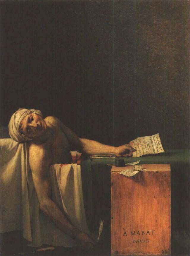 法国大革命大大促进了对历史的兴趣,大大促进了英雄题材的绘画。科普利已在英国民族的历史上寻找过事例。在他的历史画中有浪漫主义的情调,可以比作建筑中的哥特式复兴。法国革命者爱把自己看作再生的希腊人和罗马人,他们的绘画丝毫不落后于他们的建筑,同样反映出对所谓罗马的宏伟有所爱好。这种新古典派风格的最重要的艺术家是画家雅克·洛易·达维德(Jacques Louis David, 1748-1825),他是革命政府的“官方艺术家”;罗伯斯庇尔(Robespierre)曾以自命的大祭司(High Priest)身份主持过“最高主宰节”(Festival of the Supreme Being),达维德给那样一些宣传盛会设计过服装和会场。那些人觉得他们生活在英雄时代里,觉得他们当代事件跟希腊和罗马历史事件一样值得画家注目。法国革命领袖之一马拉(Marat)在他的浴室中被一个狂热的青年妇女杀死以后,达维德把他画成一个为了事业而死的烈士(图316)。马拉显然习惯于在他的浴室中工作,他的浴盆配上了一个简单的书桌。刺客交给他一份请愿书,他正要签署,刺客把他杀死。这种情境好像不大容易画成高贵而宏伟的画,但是达维德成功地使画面显示出英雄气概,却又保持着一个警方记录的现场细部。他从希腊和罗马雕刻中学会了怎样塑造躯体的肌肉和筋腱,怎样赋予躯体外形高贵的美,他也从古典艺术中学会了舍弃所有无助于主要效果的枝节细部,学会了力求单纯。画中没有繁杂的色彩,也没有复杂的短缩法。跟科普利的伟大的展品相比,达维德的画显得质朴。这是感人至深的纪念,一位谦卑的“人民之友”——马拉这样自称——正在为公共福利工作的时候成为烈士死去。