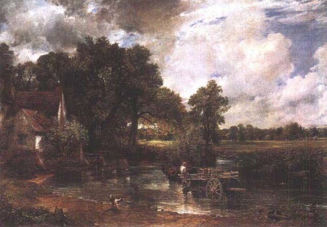康斯特布尔的想法就大不相同了。在他看来,特纳想赶超的那个艺术传统有害无益。他不是不赞美往日的大师。但是他想画自己的眼睛而不是克劳德·洛兰的眼睛所见到的东西。或许说他是接着庚斯勃罗(见470页,图307)当初的路子继续走下去。但是连庚斯勃罗也还是选择一些符合传统标准的“如画”的母题,也还把自然看作是给田园诗准备的可爱的环境。在康斯特布尔看来,那些想法都不重要。他除了真实性以外别无所求。1802年他写信给一个朋友说:“一个有画家天赋的人有足够的天地,而当前最大的毛病是bravura(胆大妄为),企图做出超越真实的东西。”那些仍然以克劳德作为样板的时髦风景画家已经创造了许多省事的诀窍,任何一个业余爱好者都能使那些诀窍构成一幅生动悦人的画。前景中的一棵动人的树,跟由画面中央展开的远景可以形成惊人的对比。配色法(colour scheme)已经井井有条地制定出来。前景中应该涂暖色,最好用棕色和金黄色调,背景应该褪为淡蓝色彩。有画云彩的配方,还有描摹布满瘤节的橡树皮的特殊诀窍。康斯特布尔鄙视这一切定型作品。据说一位朋友抱怨他没有把前景涂上必不可少的有如古老的小提琴那样柔和的棕色,康斯特布尔当即拿了把小提琴放在他面前的草地上,让那位朋友看看我们眼睛看到的鲜绿色和程式要求的暖色调之间存在的差异。但是康斯特布尔绝对无意用大胆的创新来骇人听闻,他仅仅想忠实于自己的视觉而已。他先到乡间去作写生速写,然后在画室里再细心加工。他的一些速写(图324)往往比他的完工之作更为大胆,但是时代还没有到来,公众还不承认把瞬间印象记下来就是一幅值得在展览会展出的作品。尽管如此,他的精致之作在开始展出时还是引起不快。图325是他的一幅画,1824年他把这幅画送到巴黎,就在那里出了名。它表现一个简单的乡村场面,一辆干草车正在涉水过河。我们要沉浸在画中,注视着背景中草地上的一块块有阳光的地方,观看飘浮着的云彩;我们要跟随着河水的路线,在画得那样克制而简朴的磨坊附近打量一下,去欣赏艺术家的纯真至诚,他不肯加深自然给人的印象,他毫不造作,毫不虚饰。