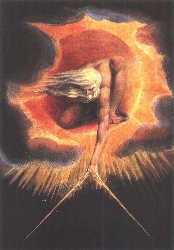 布莱克图解的就是上帝把圆规放在渊面上这个宏伟的景象。在这个创世的图像中有米开朗琪罗的上帝形象的某些东西(见312页,图200),而布莱克又是赞赏米开朗琪罗的。但在他的手中,形象已经变得有如梦幻,古怪离奇了。事实上布莱克已编成他自己的一套神话,这个幻象中的人物严格讲来不是上帝自身,而是布莱克想像中的一个人,他称之为尤里森(Urizen)。虽然布莱克把尤里森想像为创世者,但是他把人世看得很坏,所以就把创世者看成邪神恶魔了。从而这个幻象就有神秘梦魇的特征,其中的圆规似乎是漆黑的暴风雨之夜里雷电发出的闪光。