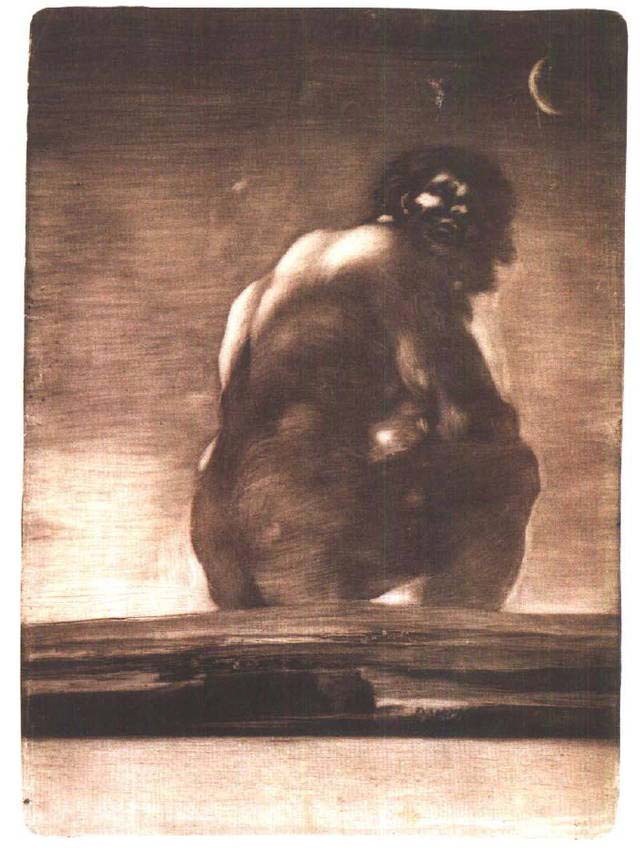 戈雅还不仅仅是作油画时坚持不受以往程式的约束。他跟伦勃朗一样,也制作了一大批蚀刻画,大都使用一种既能蚀刻线条,又能涂布阴影的新技术,叫做飞尘腐蚀法(aquatinta)。戈雅的版画最惊人的一点就是它们不是图解任何一种已知的题材,不管是《圣经》的、历史的,还是风俗的。他的版画大都是巫婆和怪诞的幽灵的奇异怪相。一些是意在谴责他在西班牙目击的愚昧而反动的势力,谴责残酷和压迫的势力,另外一些似乎只是描绘艺术家的梦魇而已。图320是他最为萦怀不忘的梦境之一——一个坐在世界边缘上的巨人形象。我们可以从前景中微小的风景推测巨人的庞大的身躯,而且可以看到他把房屋和城堡比得仅仅像个微粒而已。我们可以就这个可怕的幽灵随便发挥想像力做一番设想,它是用清楚的轮廓线画成的,仿佛是一幅写生画稿。那个庞然大物坐在月夜景色之中,好像某个邪恶的梦魇。戈雅是想到了他的国家的厄运,想到战争和人类的愚蠢给予国家的压迫呢,还是仅仅在创造一个像诗一样的意象呢?这是传统发生中断的最突出的后果——艺术家觉得有自由把他们的个人幻象画在纸上,以前只有诗人如此。
