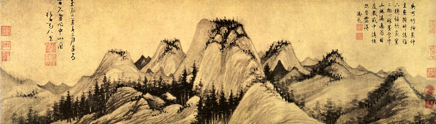 中山图 元 吴镇 图上所绘古松苍山气势非凡,藏巧于拙。古松枝丫遒劲,松针密集,非常古雅清逸,苍山突兀醒目,巍峨挺秀,岩石尖峭如削,山上绿意葱茏,在构图上的确鬼斧神…
