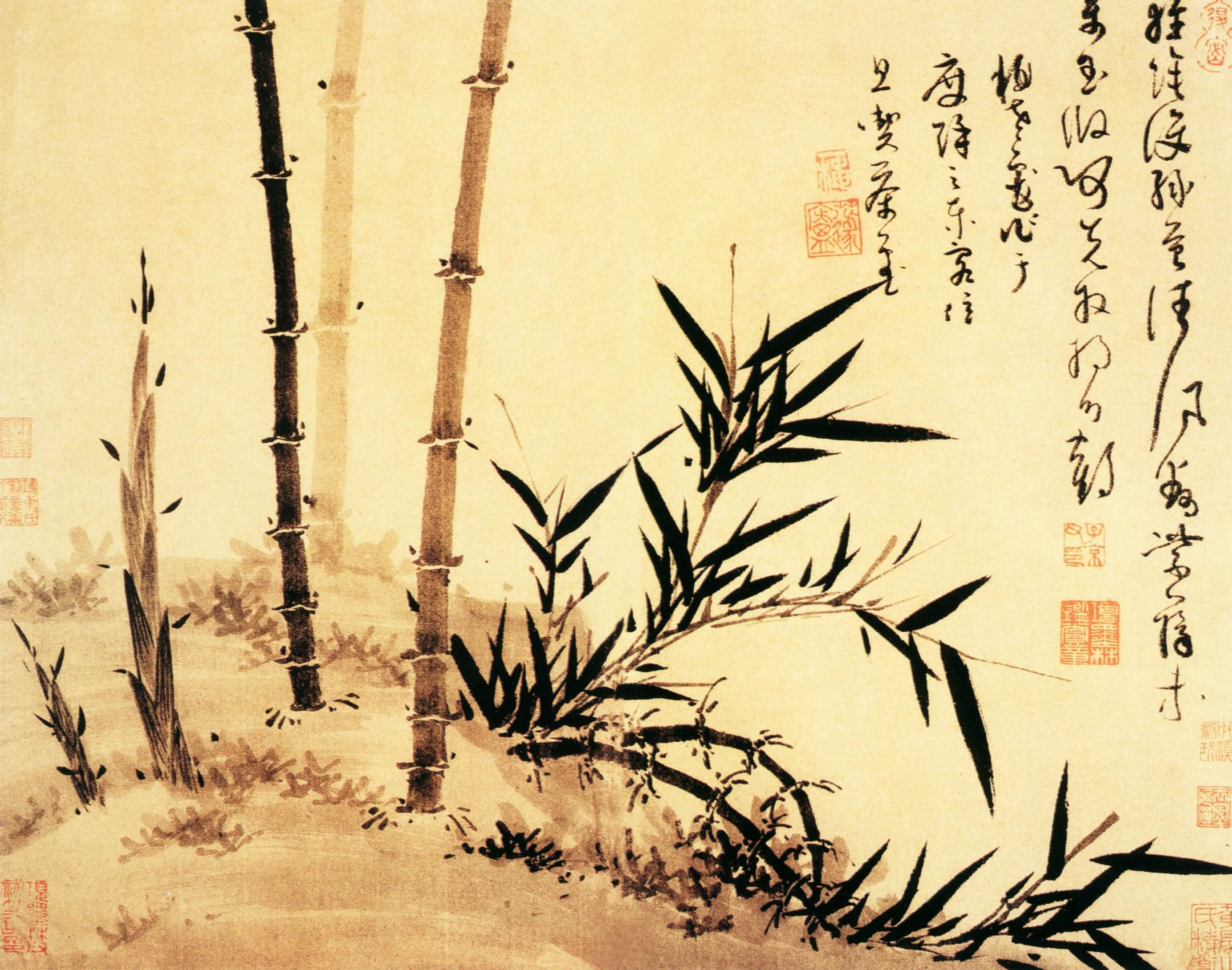 墨竹谱 吴镇 《墨竹谱》共计二十四开,是吴镇画竹的代表作。每幅之中竹的姿态、欹正仰俯、阴阳向背皆有所不同,笔法简洁苍劲。在此选其中两幅,其一写新篁始出,旁衬粗竹…