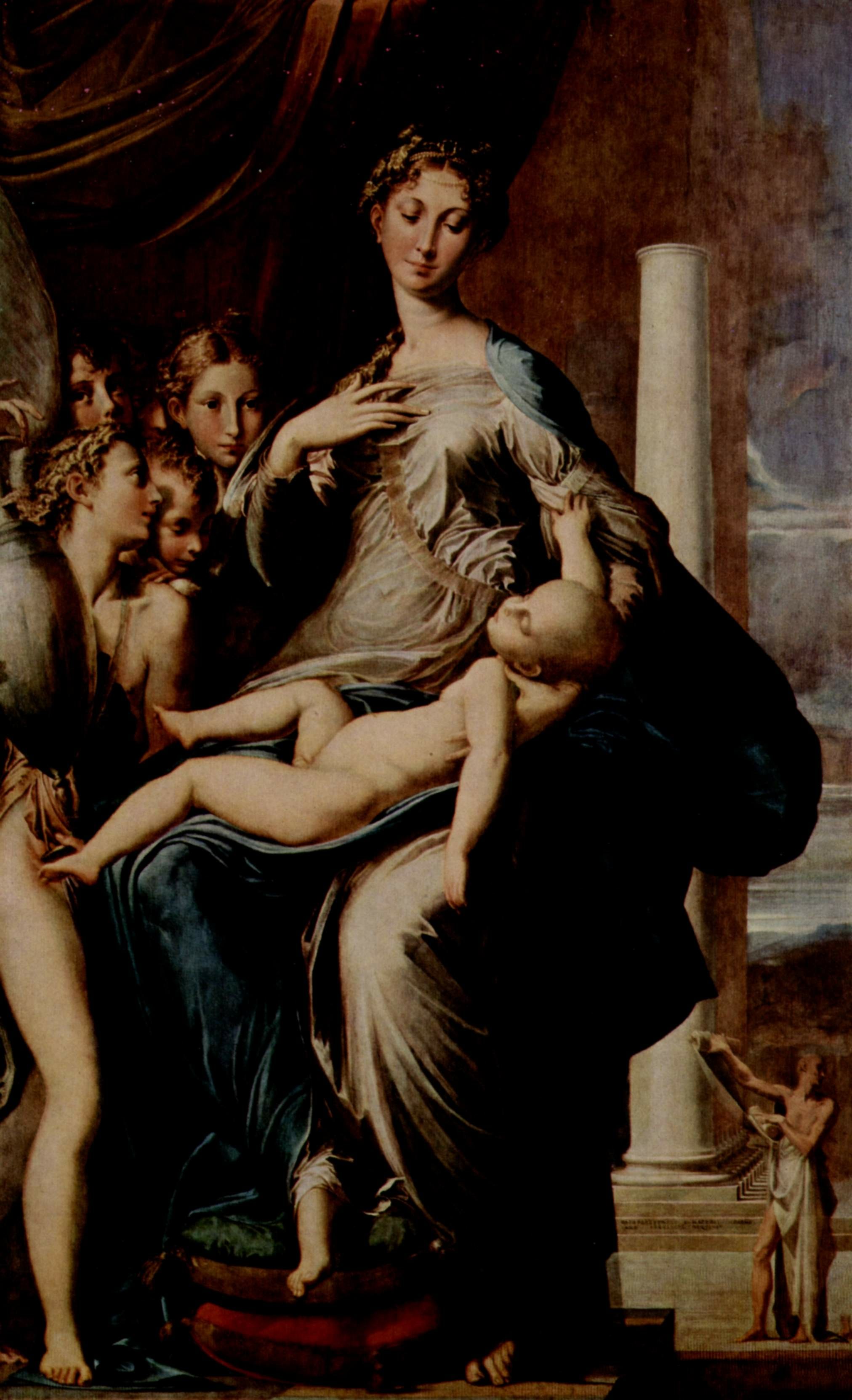 长颈圣母 意大利 帕尔米贾尼诺 此画中的人体均被拉长,显得过大的圣婴基督卧睡在圣母膝上;画面左边,五个身材修长、相貌端正的少年男女站在圣母身边。圣母有着长颈和纤细…