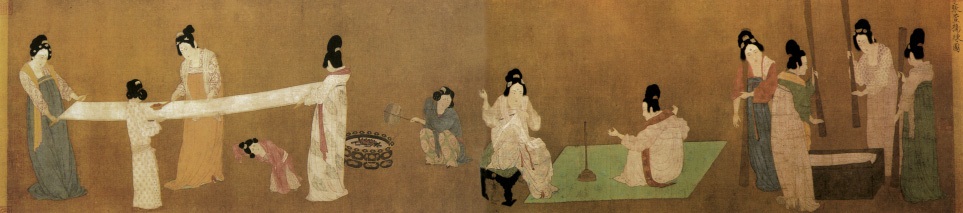 捣练图唐 张萱 绢本设色 此图是盛唐一幅重要的风俗画。画面表现宫中妇女加工绢丝的场面。全图共十二人,分成三组,起首四人捣丝,中间两人缝纫,最后一组人把绢拉直、熨平…