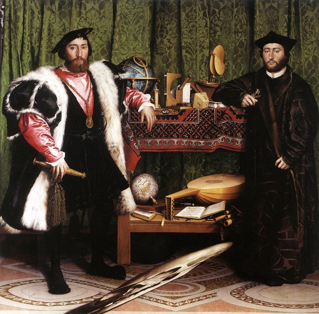 文艺复兴时期名画赏析板上蛋彩, 荷尔拜因大使们大使们德国 荷尔拜因 板上蛋彩 这是荷尔拜因纪念碑式的不朽之作。画中描绘的是法国驻英国大使约翰·德·狄特威尔和他的朋友乔治·德·赛尔夫主教。画家锐利的观察力和无可挑剔…